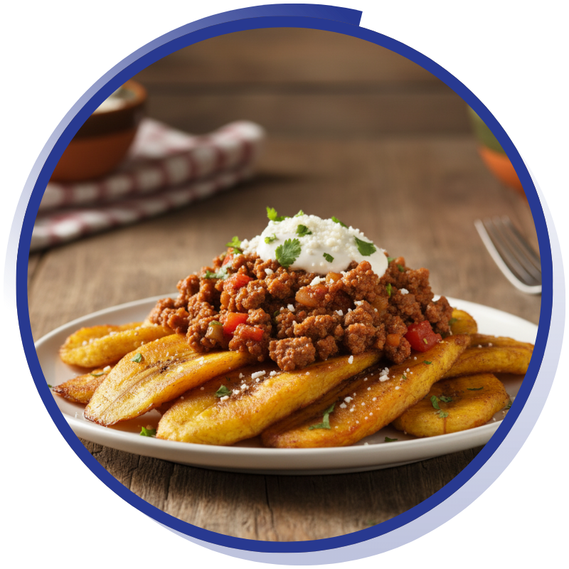 Fried plantains served with seasoned ground beef — a flavorful and traditional Latin favorite.